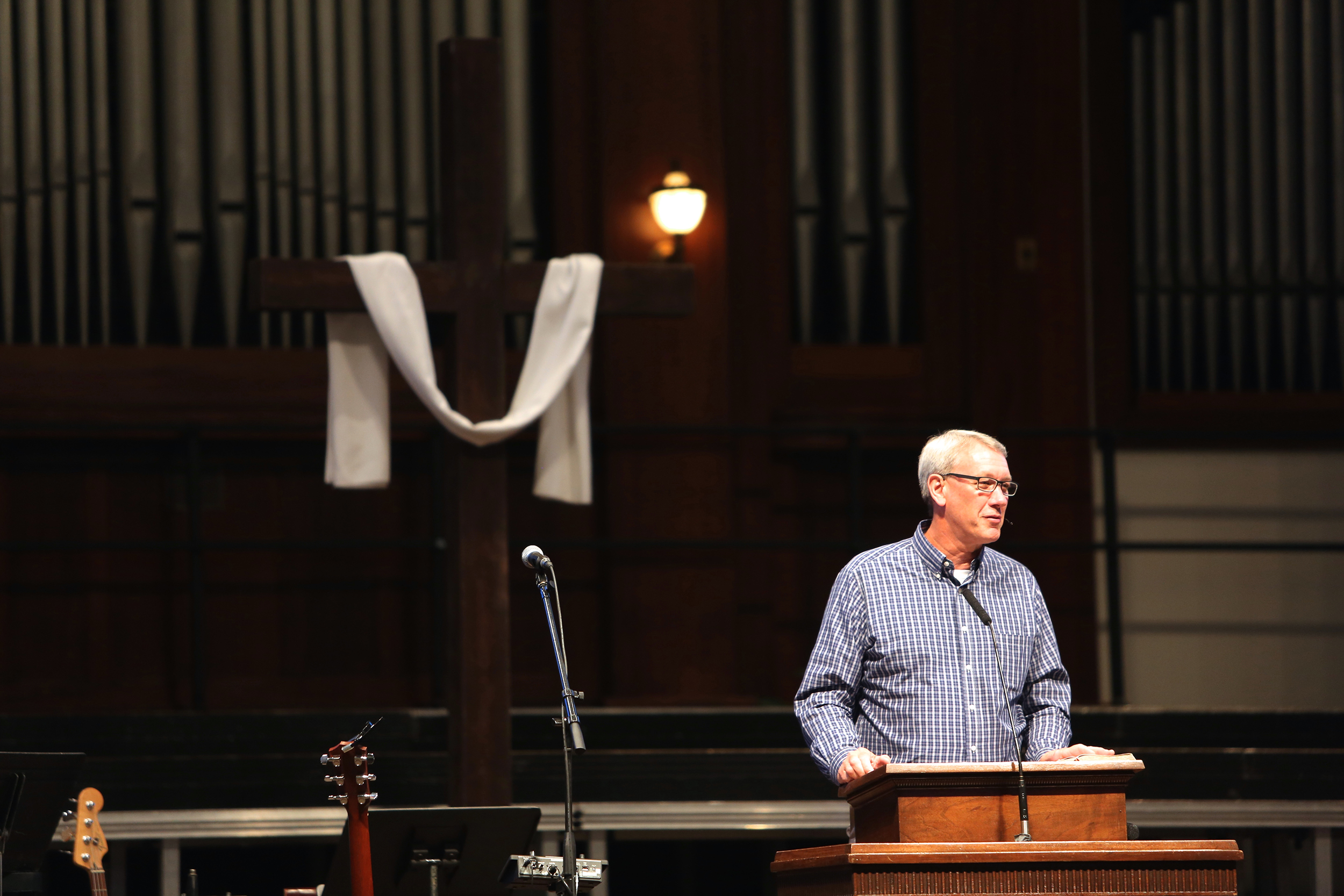 On Wednesday evening of September 16, Hughes auditorium filled with the sound of praise and prayers as nearly three hundred students lifted their hearts up to God, proclaiming their faith through singing, “I believe in God our Father. I believe in Christ the Son. I believe in the Holy Spirit. Our God is three in one!” Moments later they sat expectantly in their seats as Pastor Mark VanValin walked up to the podium to address the crowd that had gathered for the evening Fall Revival service.