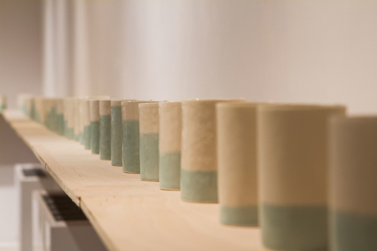 Youngquist’s exhibit, which features 156 porcelain cups and four art books, reflects this different-yet-connected nature through images of the tides and moon, as well as many different quotes on time within the art books. Working with porcelain, Youngquist’s favorite medium, also provides a unique aspect to the exhibit: the cups ‘glow’ when held up to the light, “which is especially fun with the moon icon,” Youngquist said of the exhibit on display in the art gallery in the Bistro.