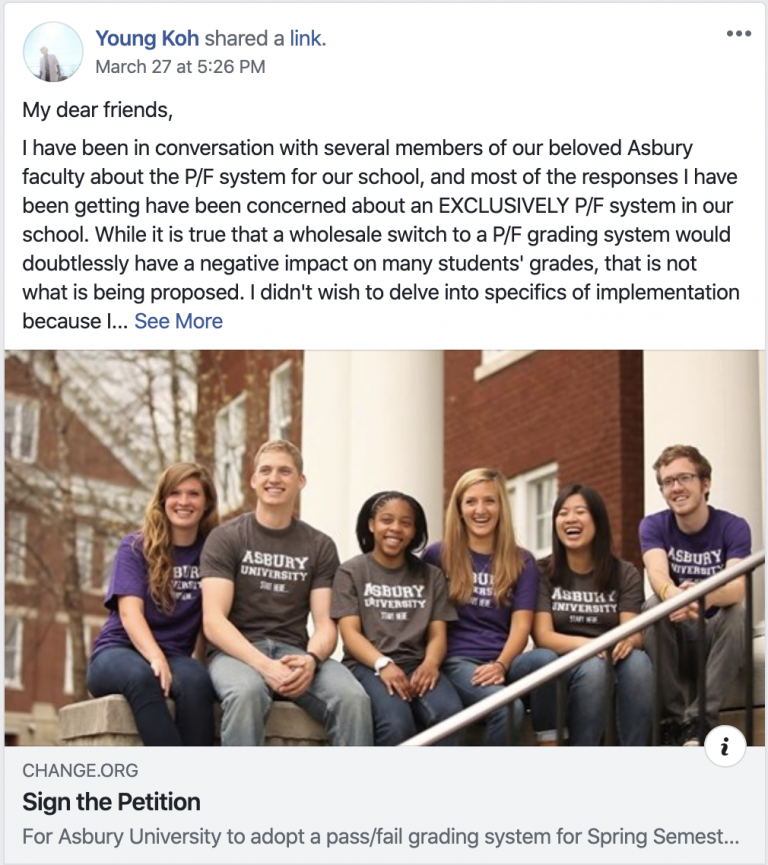 Now, it is obvious to many faculty members that these students should be addressed on a case-by-case basis. After all, Asbury is unique amongst undergraduate institutions for the genuine care and compassion that professors demonstrate to their students. But even with their willingness to accommodate students individually, I don’t think that GPA uncertainty should be something that is even left as a source of anxiety. Students should not have to reveal deeply personal circumstances and hope for grace from their instructors in order to be accommodated when they may already be under the extreme stresses that their personal lives bring.