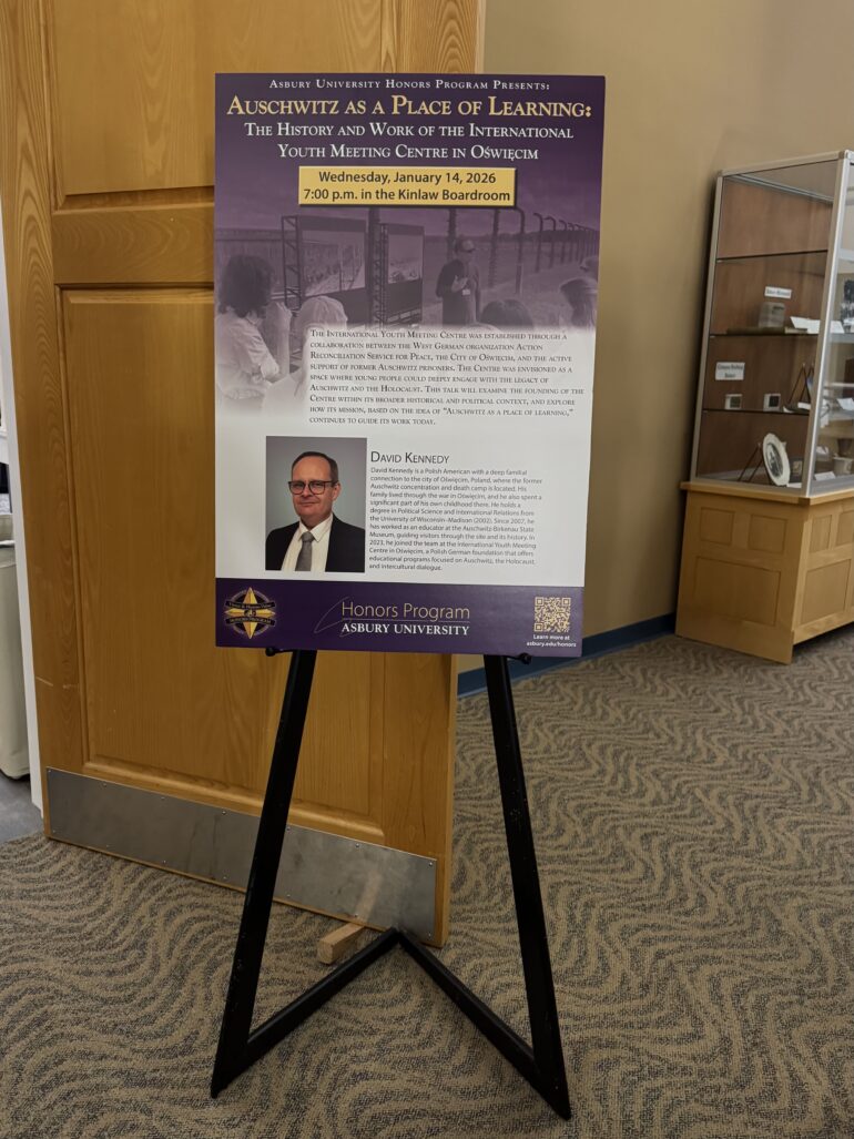 Kennedy spoke to students at Asbury on Jan. 14, emphasizing the relationship between historical knowledge and human responsibility. His visit followed years of collaboration with study-abroad programs that bring students face-to-face with sites of atrocity and survival.